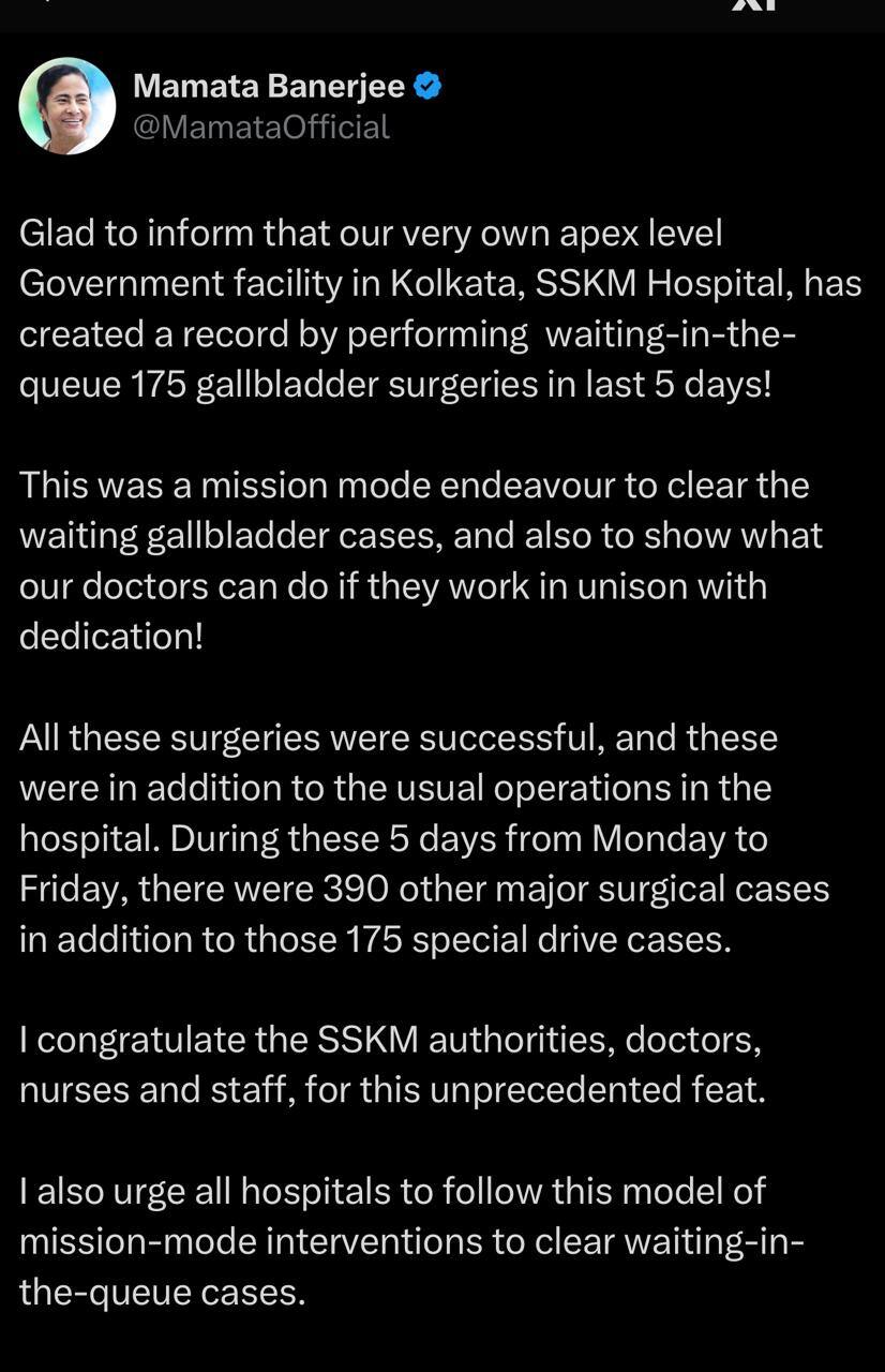 সোশ্যাল মিডিয়া এক্সে তিনি পোস্ট করে লেখেন, "আমি এই অভূতপূর্ব সাফল্যে সত্যি গর্বিত। ৫ দিনে মোট ১৭৫টি গলব্লাডার স্টোন অপারেশন করা হল। এর মাধ্যমে এটাই প্রমাণিত হয় যে ডাক্তাররা অধ্যাবসায় দিয়ে কোনও কাজ করলে তা সম্ভব করেই ছাড়েন।