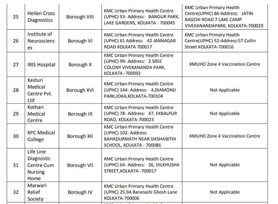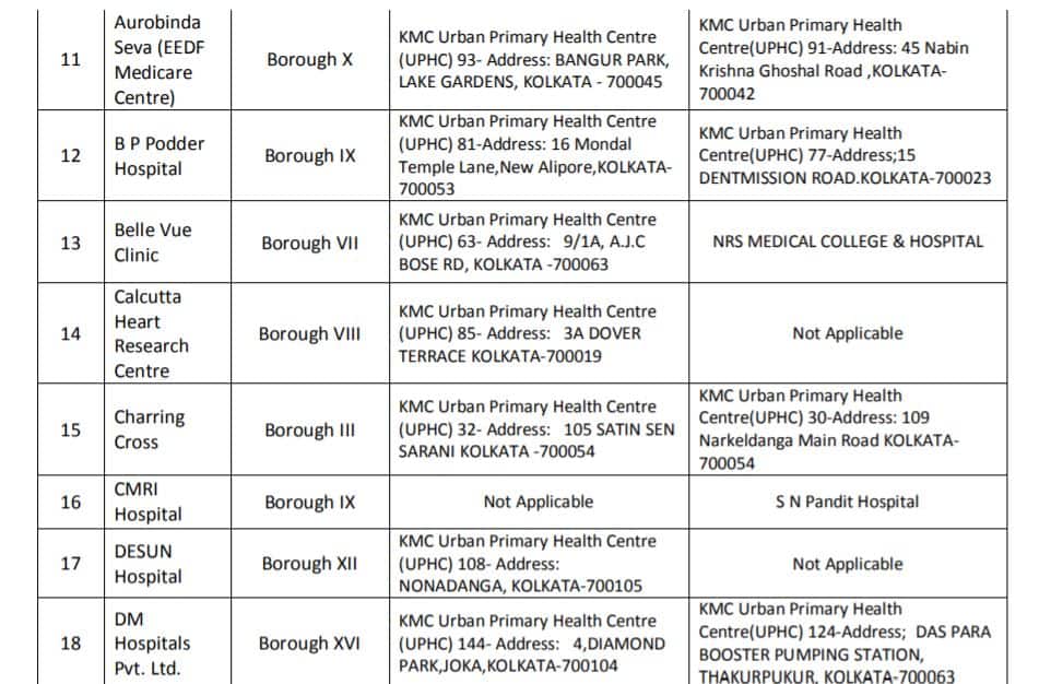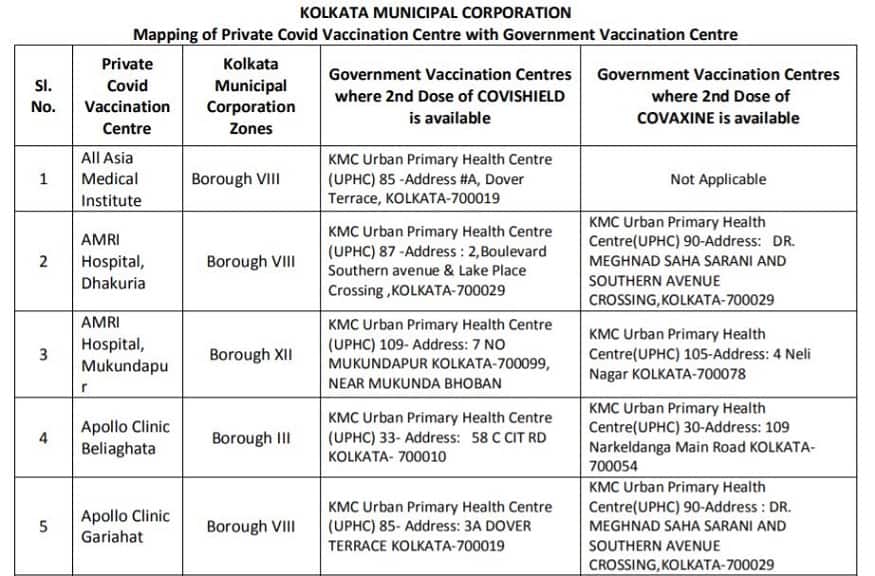 রাজ্য সরকার একটি হাসপাতালের তালিকা জানিয়েছে, যেখানে করোনা ভ্যাকসিনের দ্বিতীয় ডোজ পাওয়া যাবে। পাশাপাশি বেসরকারি হসপিটাল থেকে প্রথম ডোজ নিয়েছেন কিন্তু দ্বিতীয় ডোজ নিতে পারছেন না যারা, তাদের জন্য বেসরকারি হাসপাতাল সংলগ্ন কোন সরকারি হাসপাতাল থেকে দ্বিতীয় ডোজ পাওয়া যেতে পারে তার তালিকাও দেওয়া হল।