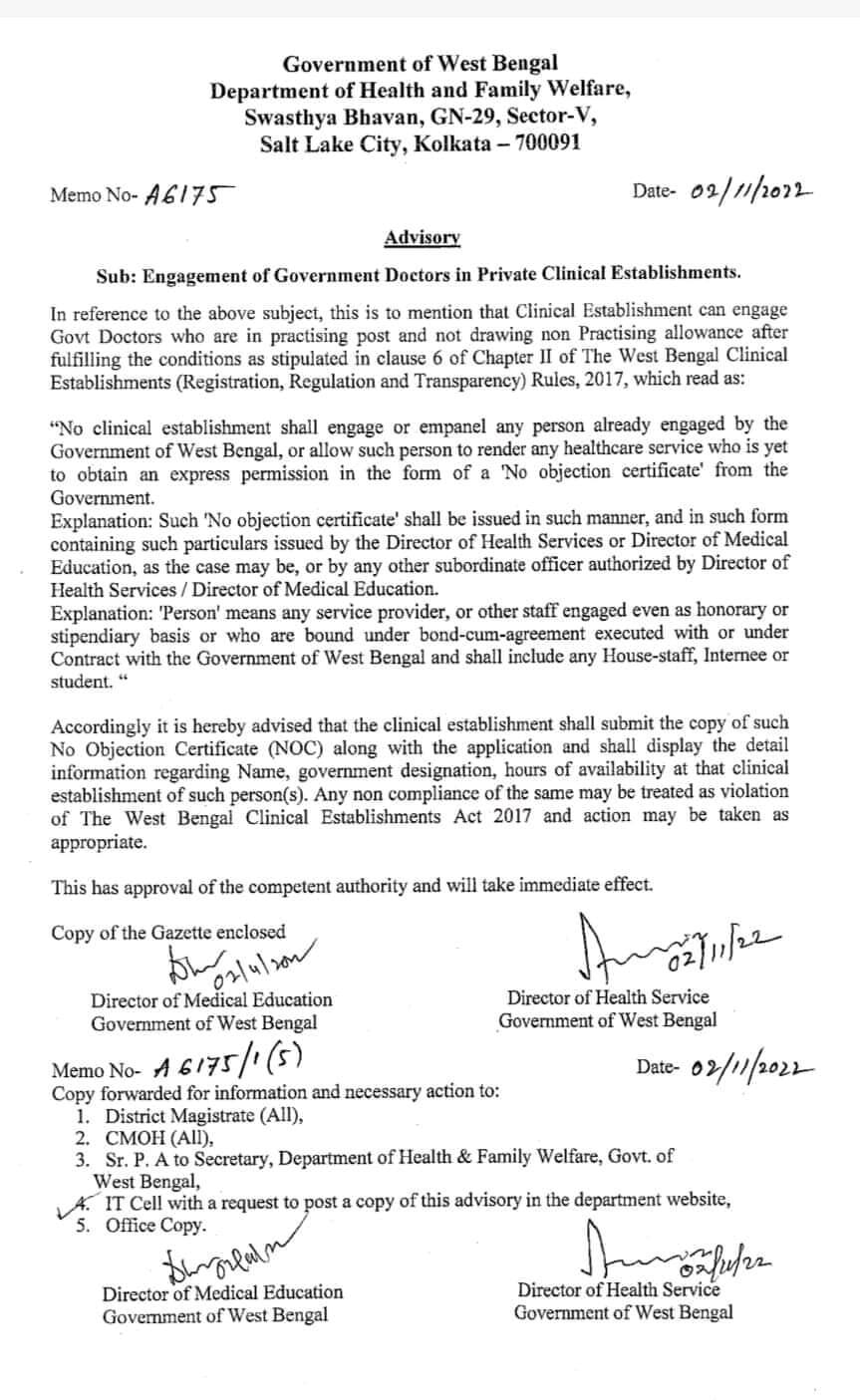 রাজ্যের সরকারি হাসপাতালের সঙ্গে যুক্ত চিকিৎসকরা এবার থেকে স্বাস্থ্য দফতরের ছাড়পত্র ছাড়া বেসরকারি হাসপাতালে চিকিৎসা করতে পারবেন না। বুধবার এই মর্মে নির্দেশ দিয়েছে রাজ্য স্বাস্থ্য দফতর