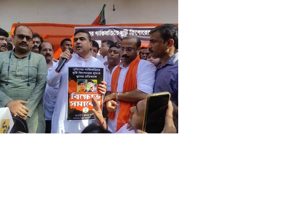 বাগুইআটি থানার সামনে বুধবার সকাল থেকে বিক্ষোভ দেখাচ্ছে বিজেপি। সেই বিক্ষোভ সমাবেশেই হাজির হন শুভেন্দু। ঘটনার প্রকৃত তদন্ত ও অভিযুক্ত পুলিশ অফিসারদের বিরুদ্ধে কঠোর শাস্তির দাবিতে থানার গেটের সামনেই স্লোগান দেন বিরোধী দলনেতা৷ এরপর বিক্ষোভ মঞ্চ থেকে পুলিশ ও সরকারের বিরুদ্ধে সুরও চড়ান তিনি।