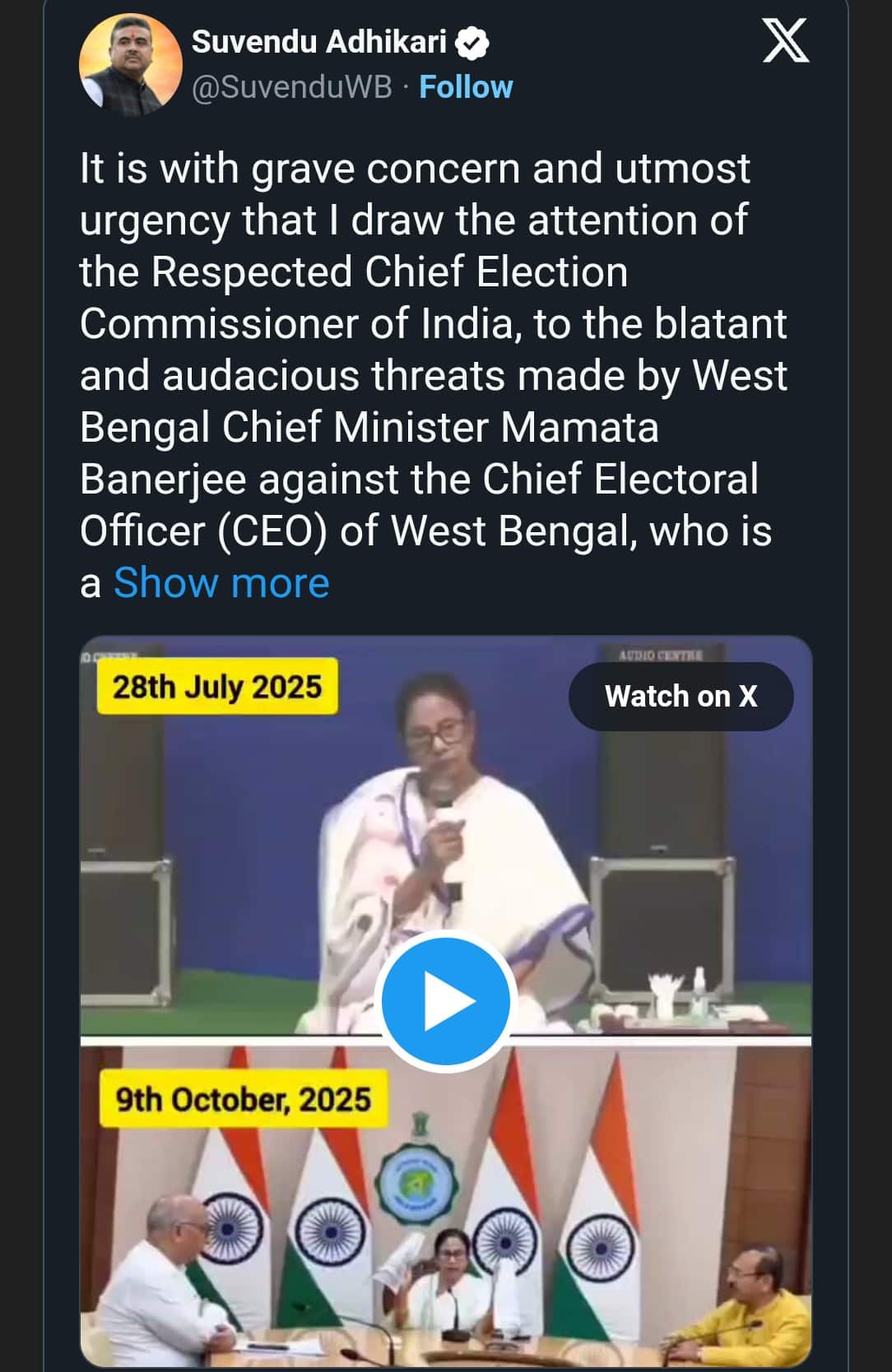 তাঁর অভিযোগ, বিএলও-দের ডেকে থ্রেট করা হয়েছে। তীয় নির্বাচন কমিশনের প্রতিনিধিরা রাজ্যে থাকা সত্ত্বেও ভোটার তালিকার বিশেষ নিবিড় সমীক্ষা নিয়ে চরম বিরোধিতা করলেন মুখ্যমন্ত্রী মমতা বন্দ্যোপাধ্যায়, যা বিহারে সম্ভব হলেও বাংলায় ভিন্ন বলে দাবি তাঁর। এক্স হ্যান্ডেলে দেশের মুখ্য নির্বাচনী আধিকারিকের নজরে এনে শুভেন্দু লিখছেন, ‘গভীর উদ্বেগের সঙ্গে আমি ভারতের মুখ্য নির্বাচন কমিশনারের দৃষ্টি আকর্ষণ করছি। বাংলার মুখ্যমন্ত্রী মমতা বন্দ্যোপাধ্যায় এ রাজ্যের মুখ্য নির্বাচনী আধিকারিকের বিরুদ্ধে হুমকি দিয়েছেন, সিইও-এর বিরুদ্ধে ভিত্তিহীন অভিযোগ তুলেছেন…’