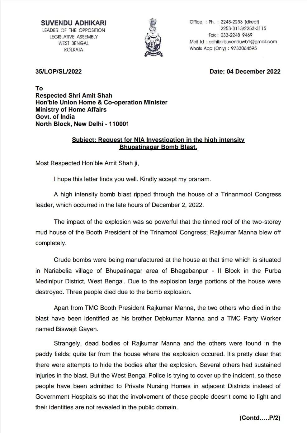 এমনকি পঞ্চায়েত দখল করতে রাজ্য জুড়ে সন্ত্রাসের বাতাবরণ তৈরি করতে চাইছে শাসক দল তৃণমূল কংগ্রেস তেমন আশঙ্কার উল্লেখও রয়েছে বিস্ফোরক এই চিঠিতে।রাজ্যের পরিস্থিতির বিস্তারিত উল্লেখ করে একদিকে ভূপতি নগরের ঘটনায় NIA তদন্তের আবেদনের পাশাপাশি কেন্দ্রীয় স্বরাষ্ট্রমন্ত্রীকে শাসক দলের বোমা গুলি বন্দুক মজুত করার অভিযোগের ব্যাপারে উপযুক্ত পদক্ষেপ নেওয়ারও আবেদন জানান শুভেন্দু অধিকারী।