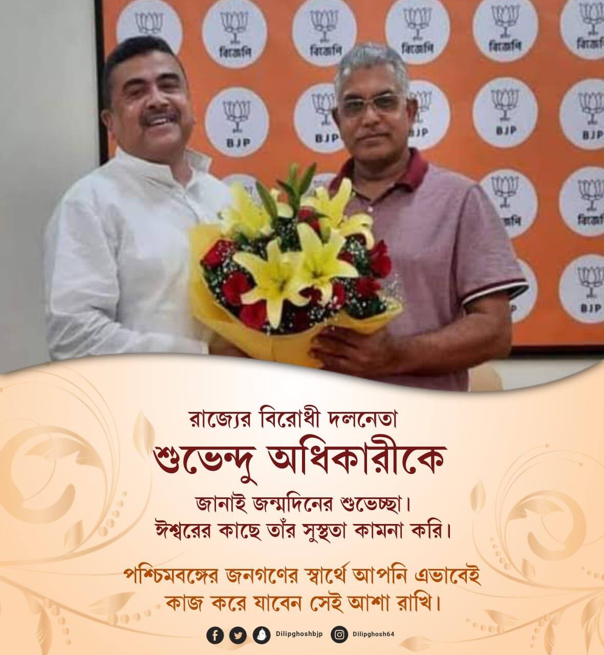 শুভেন্দুকে উত্তরীয় পরিয়ে শুভেচ্ছা জানান বিজেপির সর্বভারতীয় সহ-সভাপতি দিলীপ ঘোষ, বিজেপির রাজ্য সভাপতি সুকান্ত মজুমদার, দলের সর্বভারতীয় সাধারণ সম্পাদক (সংগঠন) বি এল সন্তোষ-সহ অন্যান্য নেতৃবৃন্দ। সম্প্রতি নাম না করে দিলীপ ঘোষকে মর্নিং ওয়াক নিয়ে শুভেন্দুর নিশানা এবং পাল্টা দিলীপ ঘোষের মন্তব্যকে কেন্দ্র করে শুভেন্দু-দিলীপ সংঘাত নিয়ে জোর চর্চা শুরু হয় রাজনৈতিক মহলে। যদিও বৃহস্পতিবার শুভেন্দু অধিকারীর জন্মদিনে সুকান্ত মজুমদার-সহ অন্যান্য পদ্ম শিবিরের নেতারা শুভেন্দুকে সোশ্যাল মিডিয়ায় একের পর এক শুভেচ্ছা বার্তা দেন।