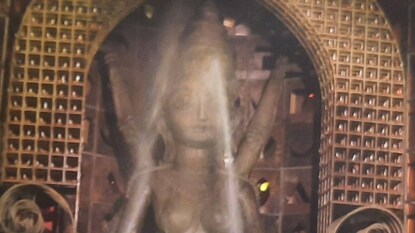 কৃত্রিম জলাশয়ে জলকামান দিয়ে মণ্ডপেই বিসর্জন কলকাতার নামী পুজোর ৪৩ ফুটের বিশাল প্রতিমা