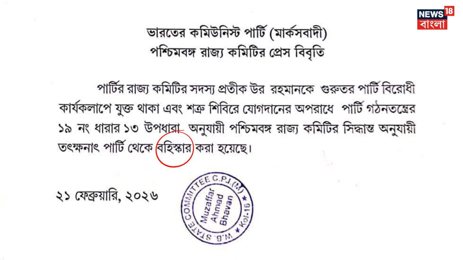 সিপিএমের জারি করা ওই বিবৃতিতে বলা হয়, ‘গুরুতর দল বিরোধী কার্যকলাপে যুক্ত থাকা এবং শত্রু শিবিরে যোগ দেওয়ার অপরাধে পার্টি গঠনতন্ত্রের ১৯ নম্বর ধারার ১৩ উপধারা অনুযায়ী প্রতীক উর রহমানকে তৎক্ষণাৎ বহিস্কার করা হয়েছে৷’