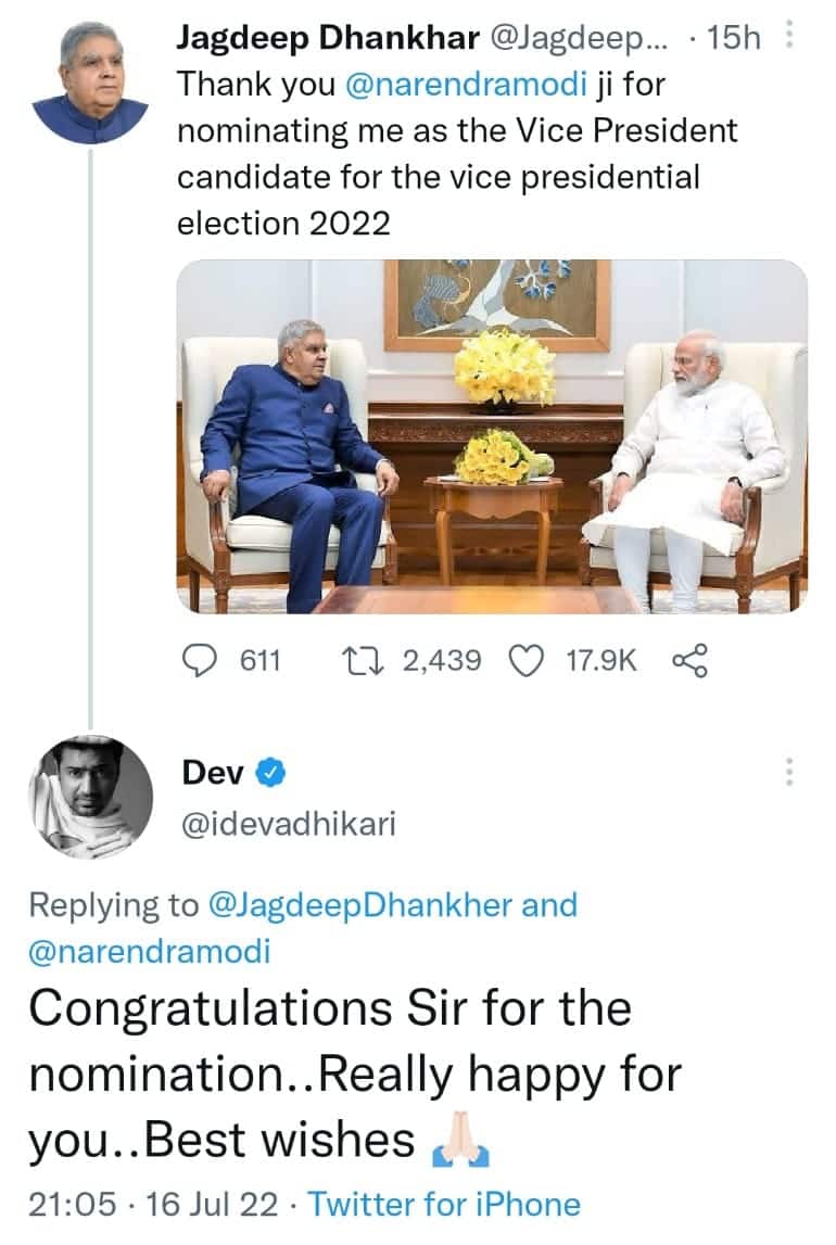 জগদীপ ধনখড়ের এক ট্যুইটের উত্তরে দেব লিখেছেন, “উপরাষ্ট্রপতি পদে মনোনয়নের জন্য আপনাকে অনেক অভিনন্দন। আপনার জন্য আনন্দিত। শুভকামনা রইল।” শনিবার বিজেপি প্রধান জেপি নাড্ডা জানান ভারতের উপরাষ্ট্রপতি পদের জন্য ক্ষমতাসীন এনডিএ-এর প্রার্থী হচ্ছেন পশ্চিমবঙ্গের রাজ্যপাল জগদীপ ধনখড়! “সমস্ত বিবেচনা এবং পরামর্শের পরে, আমরা কিষাণ পুত্র জগদীপ ধনখড়কেই বিজেপি এবং এনডিএ-এর উপরাষ্ট্রপতি প্রার্থী হিসাবে ঘোষণা করার সিদ্ধান্ত নিয়েছি,” বলেন নাড্ডা।