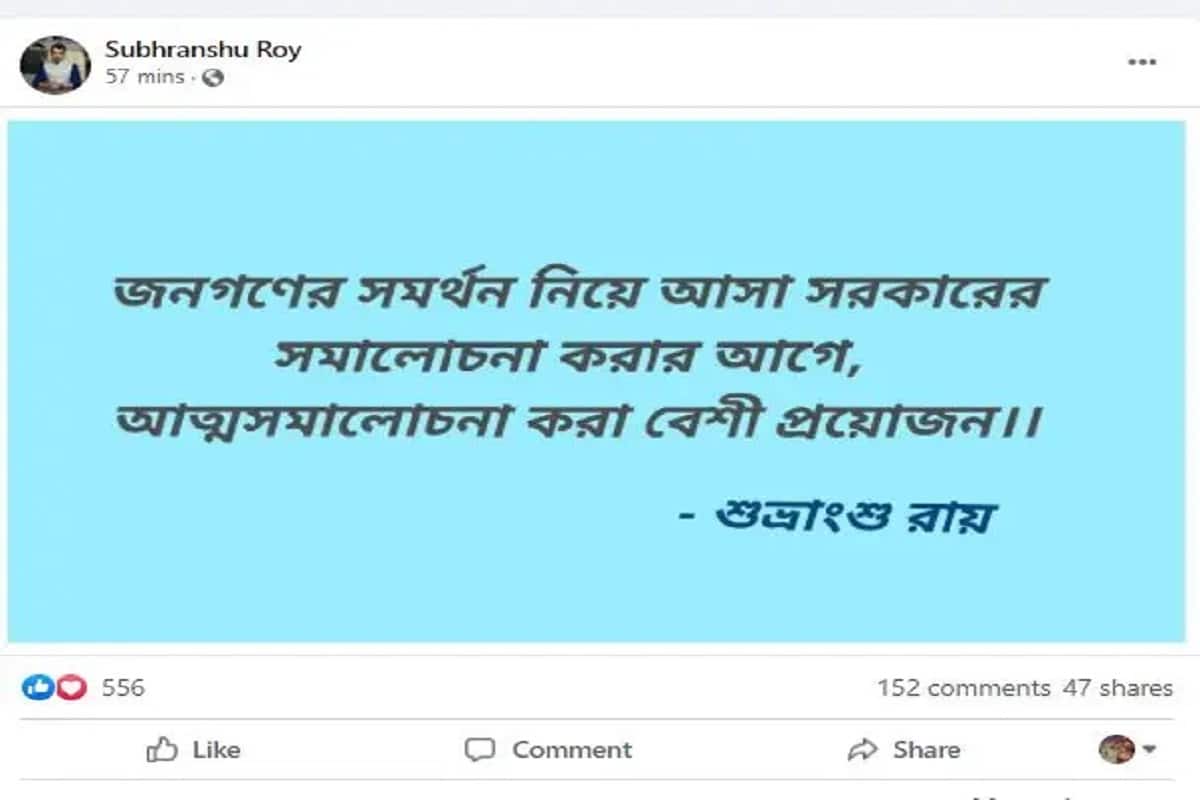 ফেসবুক পোস্টে মুকুল পুত্র লিখেছেন, 'জনগণের সমর্থন নিয়ে আসা সরকারের সমালোচনা করার আগে, আত্মসমালোচনা করা বেশি প্রয়োজন৷' তবে কী প্রেক্ষিতে তিনি এই পোস্ট করলেন, তা নিয়ে কোনও মন্তব্য করেননি শুভ্রাংশু৷ প্রতিক্রিয়া পাওয়া না গেলেও শুভ্রাংশুর পোস্ট ঘিরে রাজ্য বিজেপি-র অন্দরেও আলোড়ন ছড়িয়েছে৷ প্রসঙ্গত, এ বারের নির্বাচনে বীজপুর কেন্দ্রে পরাজিত হয়েছেন প্রাক্তন বিধায়ক শুভ্রাংশু৷ ২০১৯ সালের মে মাসে বিজেপি-তে যোগ দিয়েছিলেন তিনি৷
