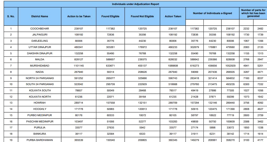 উল্লেখযোগ্য ভাবে নাম বাদ পড়েছে মুর্শিদাবাদ, উত্তর ২৪ পরগনা,কোচবিহার, দক্ষিণ ২৪ পরগনা, পূর্ব বর্ধমান জেলাতে। সংখ্যার দিক থেকে সবথেকে বেশি নাম বাদ পড়েছে মুর্শিদাবাদ জেলায়। বিচারাধীনে মুর্শিদাবাদ জেলা থেকেই সব থেকে বেশি অভিযোগের সংখ্যা ছিল। সংখ্যাটা ১১ লক্ষ ১ হাজার ১৪৫ জন৷ তার মধ্যে বৈধ ভোটার প্রমাণিত হয়েছেন, ৬ লক্ষ ৩৩ হাজার ৬৭১ জন৷ অবৈধ ৪ লক্ষ ৫৫ হাজার ১৩৭ জন৷