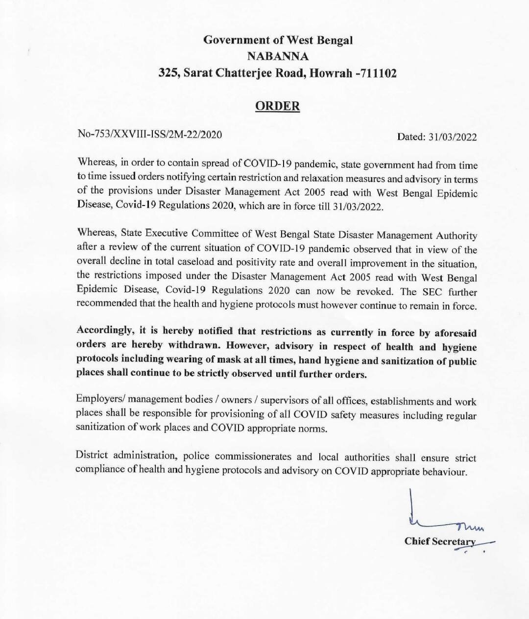 #কলকাতা: অবশেষে উঠে যাচ্ছে করোনার বিধিনিষেধ (West Bengal Covid Restrictions)। আজ ৩১ মার্চের পর থেকেই করোনা বিধি-নিষেধ উঠিয়ে নেওয়ার সিদ্ধান্ত রাজ্যের (West Bengal Covid 19 Restrictions Withdrawn)। গোটা দেশের মতোই রাজ্যেও করোনা সংক্রমণের হার হ্রাস পাওয়া ও সুস্থতার হার বৃদ্ধি পাওয়াতেই এই সিদ্ধান্ত নিয়েছে রাজ্য।