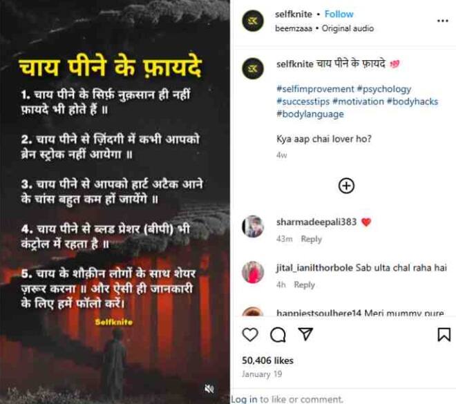 নয়াদিল্লি: একটি Instagram পোস্ট অনুযায়ী, “চা পিনে সে জীবন মে কভি আপকো ব্রেন স্ট্রোক নাহি আয়েগা” (“যদি আপনি চা পান করেন, তবে আপনার জীবনে কখনও ব্রেন স্ট্রোক হবে না!”). পোস্টটিতে আরও কিছু উপকারিতার তালিকা দেওয়া হয়েছে: চায়ের কোনও পার্শ্বপ্রতিক্রিয়া নেই, এটি হৃদরোগের স্বাস্থ্য বাড়ায় এবং রক্তচাপ নিয়ন্ত্রণ করে।