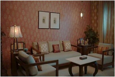 বিলাসবহুল এবং আরামদায়ক, এই রকম মিনিমাল ডেকোর-এর মধ্যে আভিজাত্য ফুটিয়ে তোলার জন্য একটি অ্যাঙ্কর পয়েন্টের খুব প্রয়োজন ছিল। এই লো-সেট কফি টেবিল ঠিক সেই চাহিদাই পূরণ করেছে। এই টিম এখানে কালার-ব্লকড থ্রো পিলো এবং মানানসই পর্দা যোগ করেছে, যা এই ঘরটিকে আরও আকর্ষণীয় বানিয়েছে।