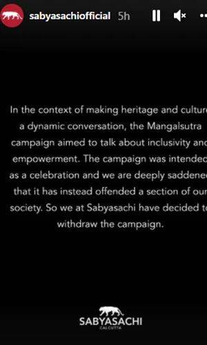 এবার সেসব প্রতিক্রিয়াকে গুরুত্ব দিয়েই মঙ্গলসূত্রের বিজ্ঞাপনটি তুলে নিলেন সব্যসাচী। নিজের সোশ্যাল মিডিয়া অ্যাকাউন্ট থেকেও বিজ্ঞাপনটি মুছে দিয়েছেন তিনি। তার বদলে ক্ষমাপ্রার্থনা করেছে তার টিম।