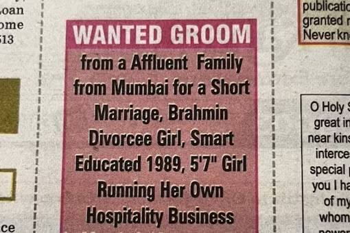 কী লেখা আছে বিজ্ঞাপনে? লেখা রয়েছে মুম্বইয়ের বিত্তবান এক ব্রাহ্মণ পরিবারের বিবাহবিচ্ছিন্না মেয়ের জন্য পাত্র চাই। তবে বিয়ে হবে স্বল্পকালীন। রয়েছে পাত্রীর বিবরণও। তরুণী শিক্ষিতা এবং সপ্রতিভ। তাঁর জন্ম ১৯৮৯ সালে। ৫ ফুট ৭ ইঞ্চি উচ্চতার ওই তরুণীর নিজস্ব ব্যবসা রয়েছে। কিন্তু নেটিজেনদের নিখাদ মজার কারণ বিজ্ঞাপনে ‘শর্ট ম্যারেজ’ শব্দদুটি।