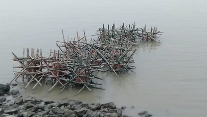 নদী পাড়ের ভাঙন রুখতে বাঁশের খাঁচা ফেলে চলছে পাড় বাঁধার কাজ