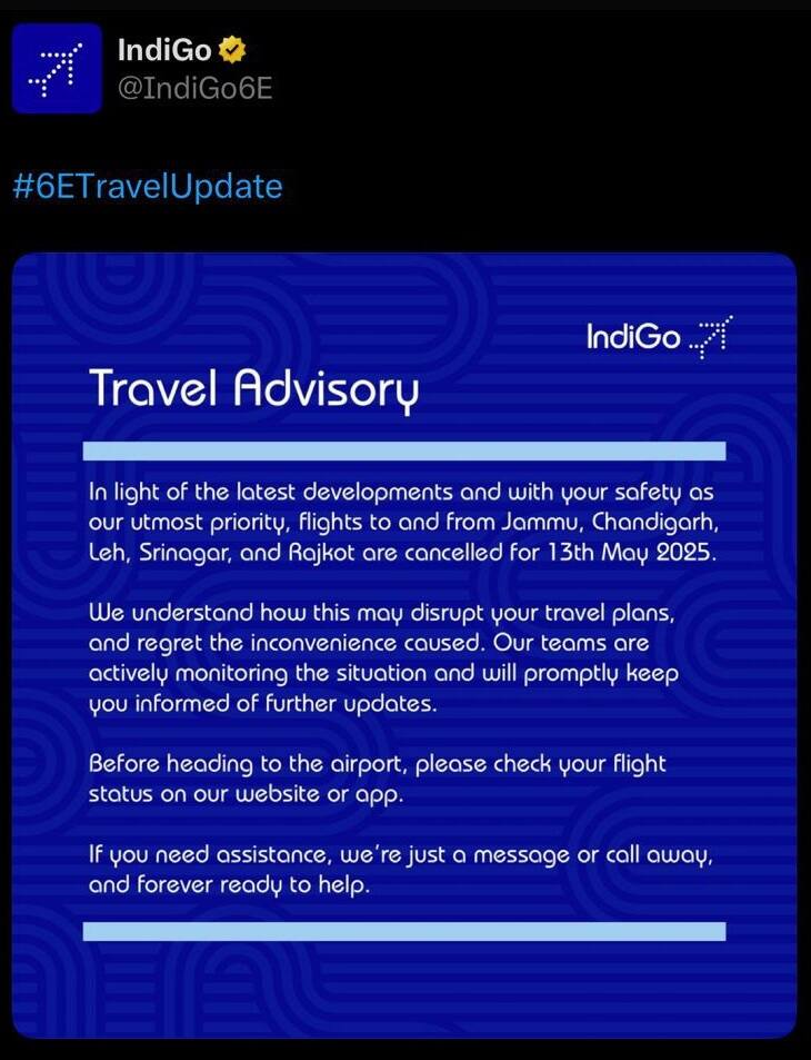 প্রভাবিত নয়টি বিমানবন্দর উত্তর, পশ্চিম এবং মধ্য ভারতের ৩২টি বিমানবন্দরের মধ্যে ছিল যা ৭ মে থেকে বাণিজ্যিক কার্যক্রমের জন্য বন্ধ ছিল। এই বিমানবন্দরগুলি সোমবার সকাল ১০:৩০ টায় ভারত এবং পাকিস্তানের মধ্যে যুদ্ধবিরতির পরে পুনরায় খোলা হয়েছিল।