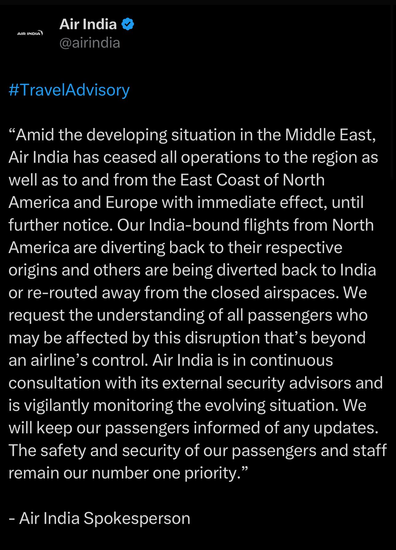 মূলত মধ্যপ্রাচ্যের শহরগুলিতে যাতায়াতের জন্য এয়ার ইন্ডিয়া এবং এয়ার ইন্ডিয়া এক্সপ্রেসের একাধিক বিমান রয়েছে ৷ বিমান সংস্থার তরফে একটি বিবৃতি বলা হয়েছে, মধ্যপ্রাচ্যের দেশগুলিতে উত্তপ্ত পরিস্থিতির জন্য ইরাক, ইরান ও ইজরায়েলের আকাশসীমার উপর দিয়ে চলাচল না-করার সিদ্ধান্ত নেওয়া হয়েছে এয়ার ইন্ডিয়া ৷ কাতারও উত্তেজনার কারণে বন্ধ করে দিয়েছে তাদের আকাশসীমা। আগামী কয়েকদিন পারস্য উপসাগরের উপর দিয়ে নির্দিষ্ট আকাশসীমা ব্যবহার করা হবে না ৷ পরিবর্তে সংযুক্ত আরব আমিরশাহি, কাতার, ওমান এবং কুয়েত-সহ বিভিন্ন গন্তব্যস্থলে যাতাযাতের জন্য বিকল্প পথ বেছে নেওয়া হবে। তবে এর ফলে গন্তব্যে পৌঁছতে বেশ কিছুটা বেশি সময় লাগতে পারে বলে আশঙ্কা করা হচ্ছে।