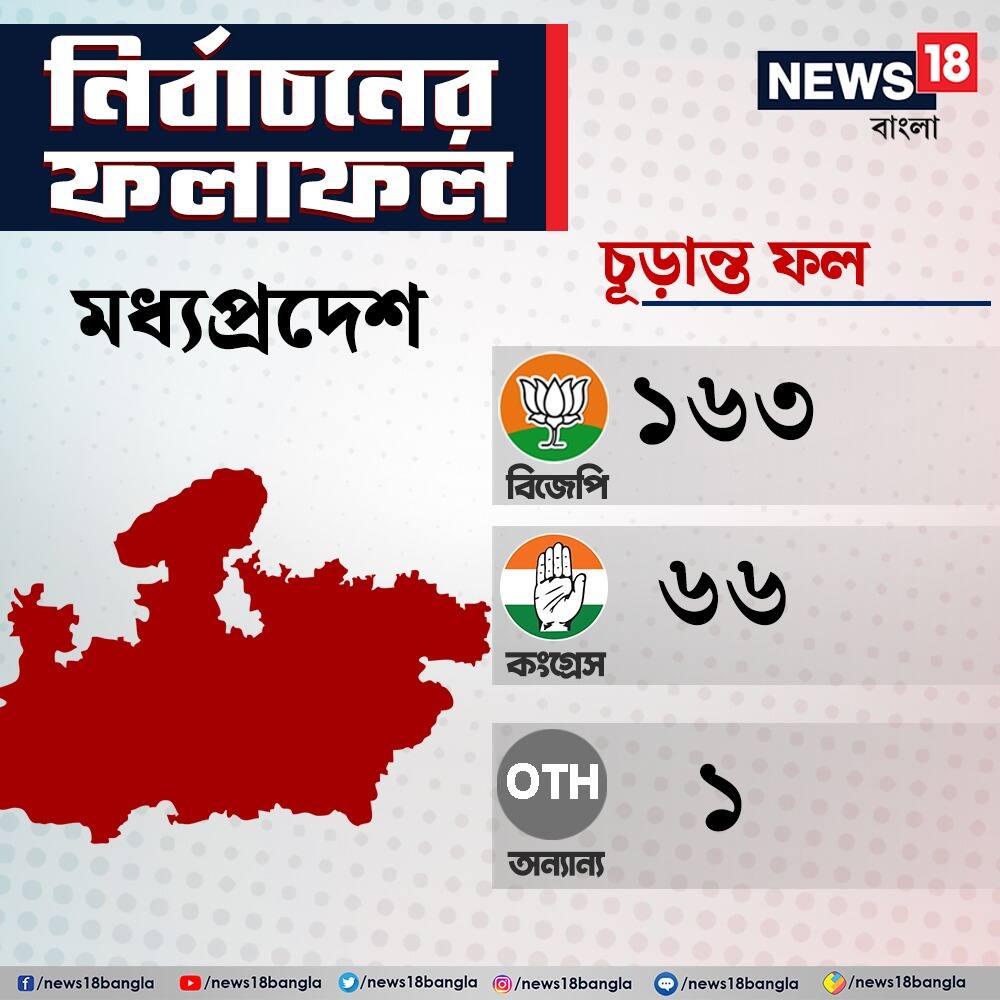 মাঝে ২ বছর বাদ দিয়ে টানা প্রায় ১৭ বছর ক্ষমতায়৷ ছিল প্রতিষ্ঠান বিরোধী হাওয়ার ভয়৷ সেই সমস্ত আশঙ্কাকে ফুৎকারে উড়িয়ে দিয়ে মধ্যপ্রদেশে একক সংখ্যাগরিষ্ঠতা নিয়েই ক্ষমতায় ফিরছে বিজেপি৷ চূড়ান্ত ফলাফল অনুযায়ী, মধ্যপ্রদেশের ২৩০টি আসনের মধ্যে একক ভাবে ১৬৩টি আসন দখল করেছে বিজেপি৷ ৬৬টি আসনে জয়ী হয়েছে কংগ্রেস৷ অন্যান্যরা পেয়েছে ১টি আসন৷