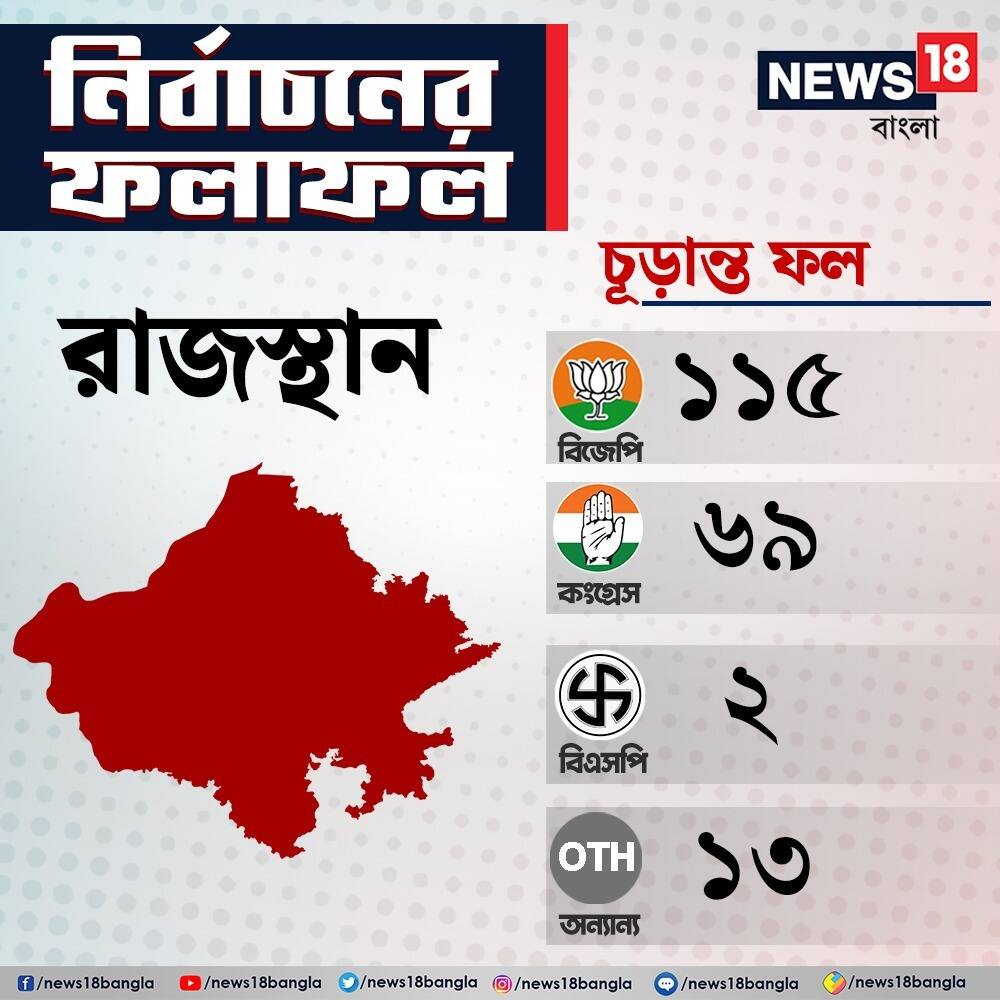 দীর্ঘদিনের ধারা বজায় রেখেই ফের রাজস্থানে পালাবদল হল৷ কংগ্রেসকে অনেক পিছনে ফেলে একক সংখ্যাগরিষ্ঠতা নিয়ে ক্ষমতায় ফিরল বিজেপি৷ রাজস্থান বিধানসভার ২০০টি আসনের ১৯৯টিতে ভোট হয়েছিল৷ বিজেপি একাই জিতেছে ১১৫টি আসনে৷ ৬৯টি আসনে জয়ী হয়েছে কংগ্রেস৷ মায়াবতীর দল বিএসপি জয়ী হয়েছে ২টি আসনে৷ অন্যান্যরা দখল করেছে ১৩টি আসন৷