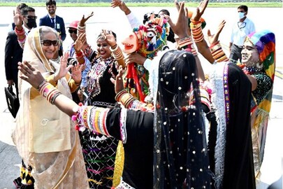 সংবাদ সংস্থা এএনআই একটি ভিডিও পোস্ট করেছেন। সেইখানে হাসিনাকে বিমান বন্দরে কর্মকর্তাদের অভ্যর্থনা জানাতে দেখা যায়। তারপর ঢোলের তালে নাচতে থাকা শিল্পীদের সঙ্গে যোগ দেন বাংলাদেশের প্রধাণমন্ত্রী। তিনি ঐতিহ্যবাহী পোশাক পরে শিল্পীদের সঙ্গে একটি ছবির জন্য পোজও দিয়েছেন।
