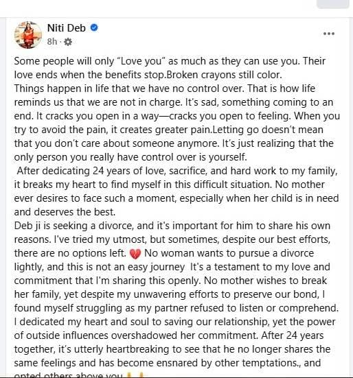 সামাজিক মাধ্যমে বিবাহবিচ্ছেদের দাবি নীতির। ছবি- সমাজ মাধ্যম