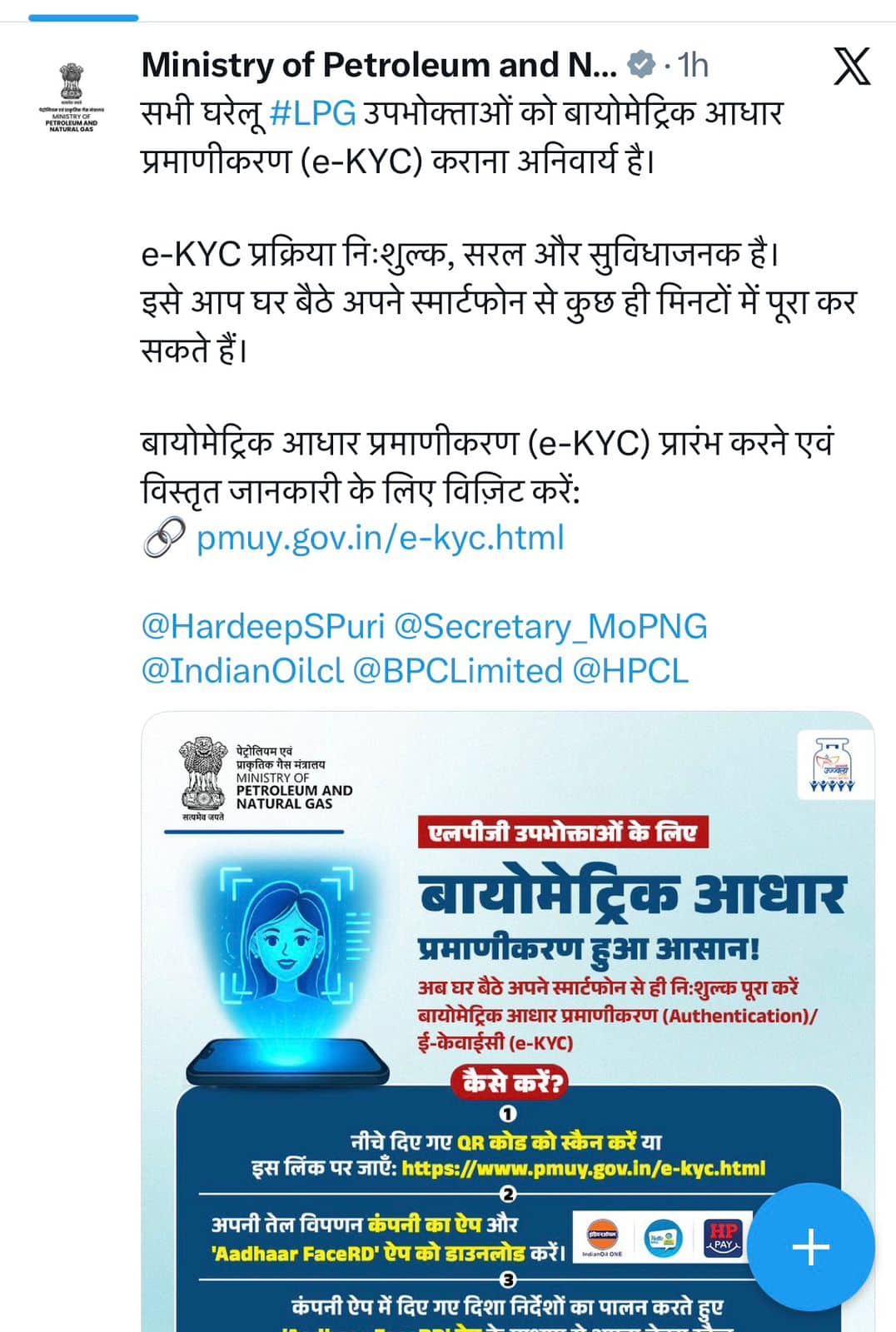 মন্ত্রকের তরফে সোশ্যাল মিডিয়ায় জানানো হয়েছে, এলপিজি গ্রাহকদের আধার ভিত্তিক বায়োমেট্রিক যাচাই (e-KYC) সম্পন্ন করতে হবে। এই প্রক্রিয়া সম্পূর্ণ বিনামূল্যে এবং খুবই সহজ। স্মার্টফোনের মাধ্যমেই কয়েক মিনিটের মধ্যে গ্রাহকরা এই কাজটি সম্পন্ন করতে পারবেন বলে জানানো হয়েছে।