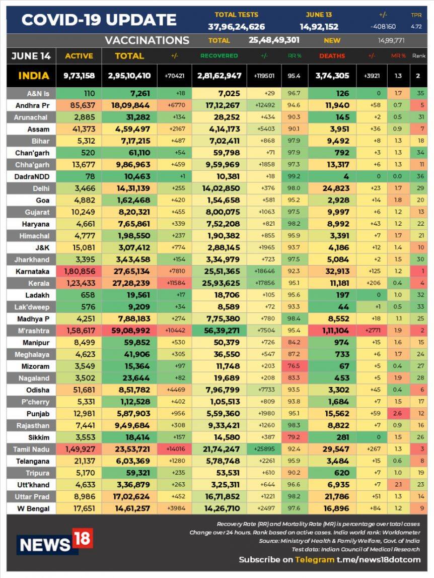 গত ২৪ ঘণ্টায় করোনায় আক্রান্ত হয়ে মৃত্যু হয়েছে ৩ হাজার ৯২১ জনের। দেশে এখনও পর্যন্ত করোনায় মৃত্যু হয়েছে ৩ লাখ ৭৪ হাজার ৩০৫ জনের। তবে স্বস্তির খবর, দেশে কোভিড আক্রান্তদের মধ্যে সুস্থ হয়েছেন ২ কোটি ৮১ লাখ ৬২ হাজার ৯৪৭ জন। করোনাকে হারিয়ে একদিনে দেশে সুস্থ হয়েছেন ১ লাখ ১৯ হাজার ৫০১ জন। সক্রিয় করোনা আক্রান্তের সংখ্যা ৯ লাখ ৭৩ হাজার ১৫৮। দেশে সুস্থতার হার ৯৫.৪ শতাংশ। মোট টিকাকরণ হয়েছে ২৫ কোটি ৪৮ লাখ ৪৯ হাজার ৩০১ জনের।