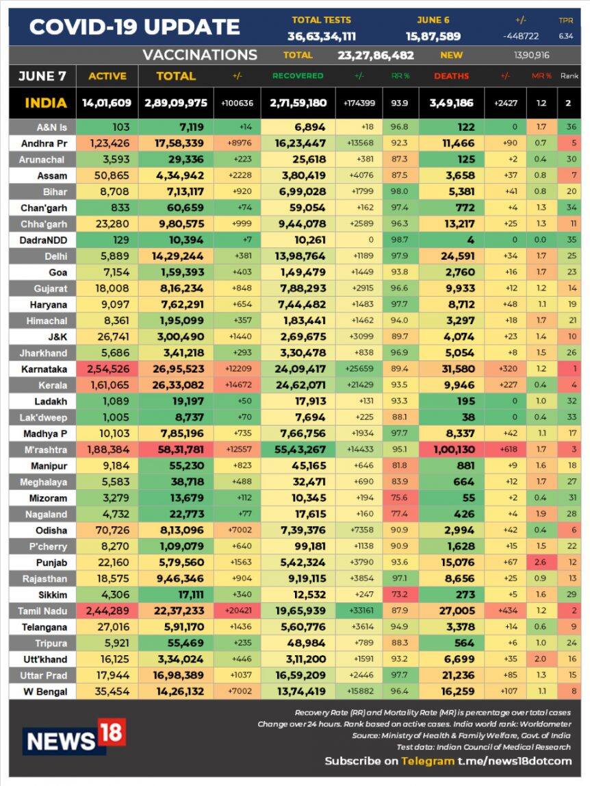 সরকারি হিসেবে মহারাষ্ট্রে মোট আক্রান্তের সংখ্যা দাঁড়িয়েছে ৫৮ লক্ষ ৩১ হাজার ৭৮১ আর মৃত্যু হয়েছে ১,০০,১৩০ জনের৷ গত ২৪ ঘণ্টায় মহারাষ্ট্রে নতুন করে করোনা আক্রান্ত হয়েছেন ১২,৫৫৭ জন আর মৃত্যু হয়েছে ৬১৮ জনের। কর্ণাটকে আক্রান্তের সংখ্যা বেড়ে দাঁড়িয়েছে ২৬ লক্ষ ৫৫ হাজার ৫২৩ জন আর মৃত্যু হয়েছে ৩১,৫৮০ জনের। গত ২৪ ঘণ্টায় আক্রান্ত হয়েছে ১২,২০৯ জন। কেরলে আক্রান্ত ২৬ লক্ষ ৩৩ হাজার ৮২ জন। মৃত্যু হয়েছে ৯,৯৪৬ জনের। গত ২৪ ঘণ্টায় আক্রান্ত হয়েছে ১৪,৬৭২ জন। তামিলনাড়ুতে মোট আক্রান্তের সংখ্যা দাঁড়িয়েছে ২২ লক্ষ ৩৭ হাজার ২৩৩ জন আর মৃত্যু হয়েছে ২৭,০০৫ জনের।