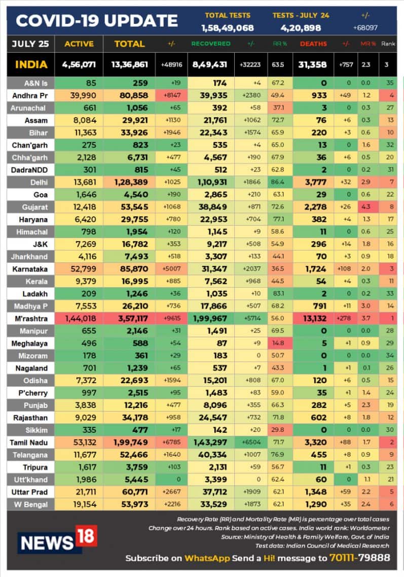 দেশের মধ্যে সব থেকে উদ্বেগজনক অবস্থা মহারাষ্ট্র, গুজরাত, তামিলনাডু ও দিল্লি ৷ সরকারি হিসেবে মহারাষ্ট্রে মোট আক্রান্তের সংখ্যা দাঁড়িয়েছে ৩ লক্ষ ৫৭ হাজার ১১৭ আর মৃত্যু হয়েছে ১৩,১৩২ জনের৷ গত ২৪ ঘণ্টায় মহারাষ্ট্রে নতুন করে করোনা আক্রান্ত হয়েছেন ৯,৬১৫ জন। আক্রান্তের সংখ্যায় দ্বিতীয় স্থানে তামিলনাড়ু। সেখানে মোট আক্রান্তের সংখ্যা দাঁড়িয়েছে ১ লক্ষ ৯৯ হাজার ৭৪৯ আর মৃত্যু হয়েছে ৩,৩২০ জনের। এর পরেই রয়েছে দিল্লি, এ রাজ্যে আক্রান্ত ১ লক্ষ ২৮ হাজার ৩৮৯ জন। মৃত্যু হয়েছে ৩,৭৭৭ জনের। কর্ণাটকে আক্রান্তের সংখ্যা বেড়ে দাঁড়িয়েছে ৮৫,৮৭০ আর মৃত্যু হয়েছে ১,৭২৪ জনের।