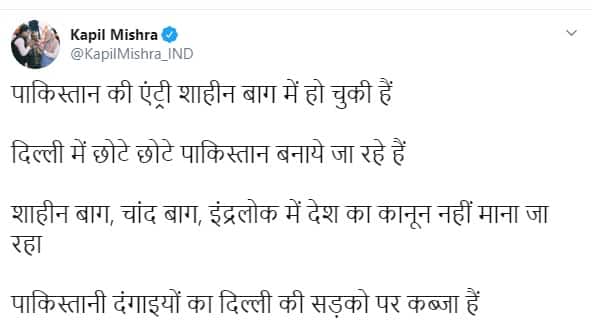 এখানেই শেষ নয়৷ কপিলের ট্যুইট, 'পাকিস্তানের প্রবেশ শাহিনবাগে হয়ে গিয়েছে৷ দিল্লিতেও ছোট ছোট পাকিস্তান তৈরি করা হচ্ছে৷' কপিলের এই ট্যুইটের পরেই নির্বাচন কমিশনের রোষের মুখে পড়েন কপিল৷ কমিশন জানিয়ে দেয়, নির্বাচনী বিধির ধারা লঙ্ঘন হয়েছে৷ কোনও প্রার্থী এমন কোনও কাজ করতে পারেন না, যা কোনও জাতি, সম্প্রদায় বা ধর্মের মানুষকে হিংসামূলক উস্কানি দেয়৷