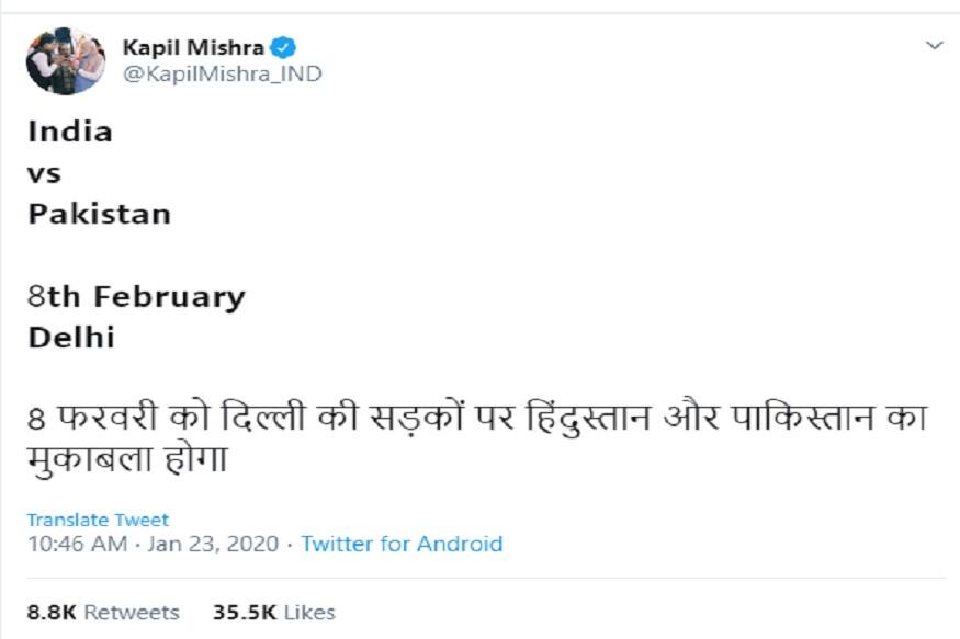৮ ফেব্রুয়ারি দিল্লি নির্বাচন৷ রাজনৈতিক তর্জা তুঙ্গে৷ এ হেন পরিস্থিতিতে বৃহস্পতিবার বিজেপি প্রার্থী কপিল মিশ্র ট্যুইট করেন, 'দিল্লির মধ্যে অনেকগুলি মিনি পাকিস্তান তৈরি হয়েছে৷ ৮ ফেব্রুয়ারি দিল্লির রাজপথে ভারত বনাম পাকিস্তান লড়াই হবে৷'