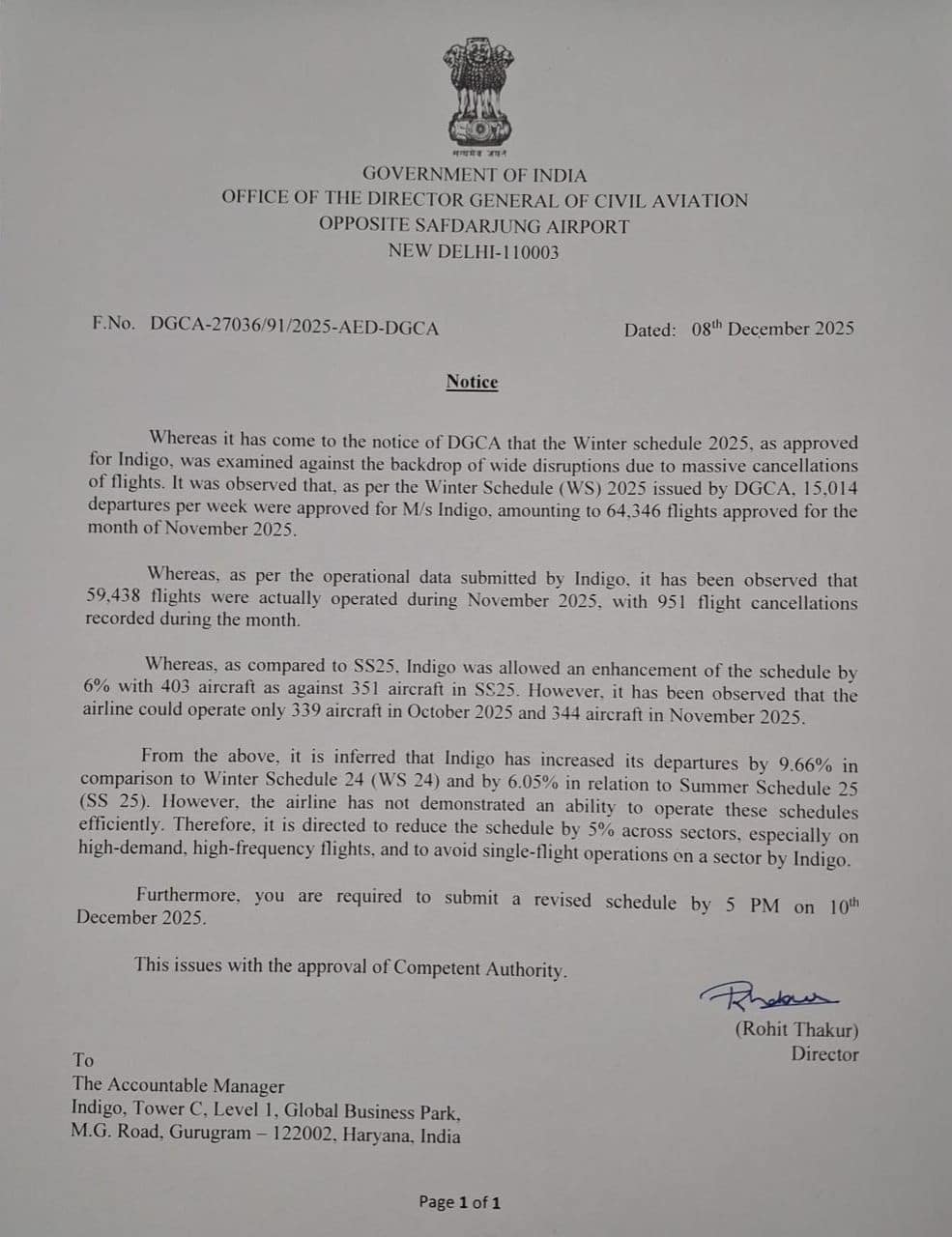 ইন্ডিগোকে ৫ শতাংশ উড়ান কমাতে নির্দেশ দিয়েছে ডিজিসিএ। যার ফলে নিত্য ইন্ডিগোর ১১০টি করে উড়ান কমার সম্ভাবনা। এমনকি ইন্ডিগোর শীতকালীন বিমান পরিষেবা অন্য উড়ান সংস্থাকে দেওয়ার কথাও ভাবছে কেন্দ্র। এই বিষয়ে কেন্দ্রীয় অসামরিক বিমান পরিবহণমন্ত্রী কে রামমোহন নাইডু জানিয়েছেন, ‘ইন্ডিগোর বিমান পরিষেবা কমাব আমরা। বর্তমানে ২,২০০টি বিমান উড়ছে তাদের। সেগুলিও কমাব।’