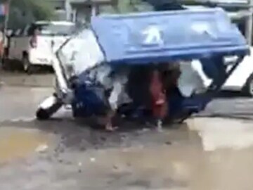 উত্তরপ্রদেশে প্রশাসনিক আধিকারিকদের সামনেই জল জমে থাকা রাস্তায় উল্টে গেল একটি ই-রিকশা। কিন্তু কোনো কর্মকর্তাই তাঁদের গাড়ি থেকে নেমে তাদের সাহায্য করার চেষ্টা করেননি।