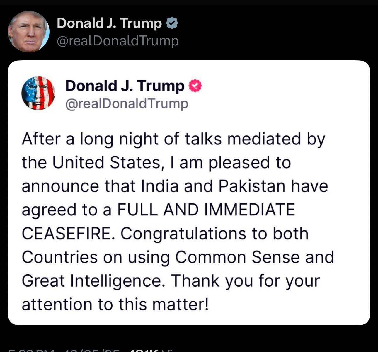 শনিবার আমেরিকার প্রেসিডেন্ট ডোনাল্ড ট্রাম্প সোশ্যাল মিডিয়ায় এক্স হ্যান্ডেলে পোস্ট করে জানানন, ‘‘ আমি আনন্দের সঙ্গে জানাচ্ছি, দীর্ঘ আলোচনার পর আমেরিকার মধ্যস্থতায় ভারত এবং পাকিস্তান একটি সম্পূর্ণ এবং তাত্ক্ষণিক যুদ্ধবিরতিতে সম্মত হয়েছে। উভয় দেশকে অভিনন্দন।’’