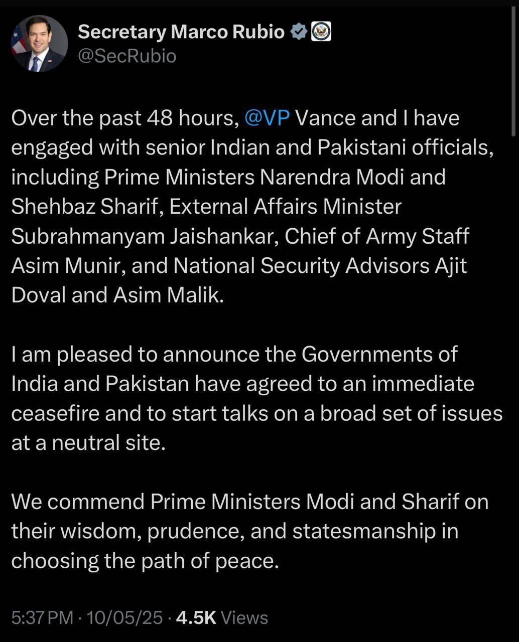 আমেরিকার বিদেশসচিব মার্কো রুবিও শেয়ার করেন আমেরিকার প্রেসিডেন্টের বার্তা। তিনি জানান, দুই নেতার সঙ্গে আলোচনা করেছেন মার্কিন প্রেসিডেন্ট। পহেলগাঁওতে পর্যটকদের উপর সন্ত্রাসবাদী হামলার পর পাকিস্তানের ৯ টি জঙ্গি ঘাঁটিতে আক্রমণ করে ভারত। পর উভয় পক্ষকে উত্তেজনা কমানোর জন্য বলে আমেরিকা।