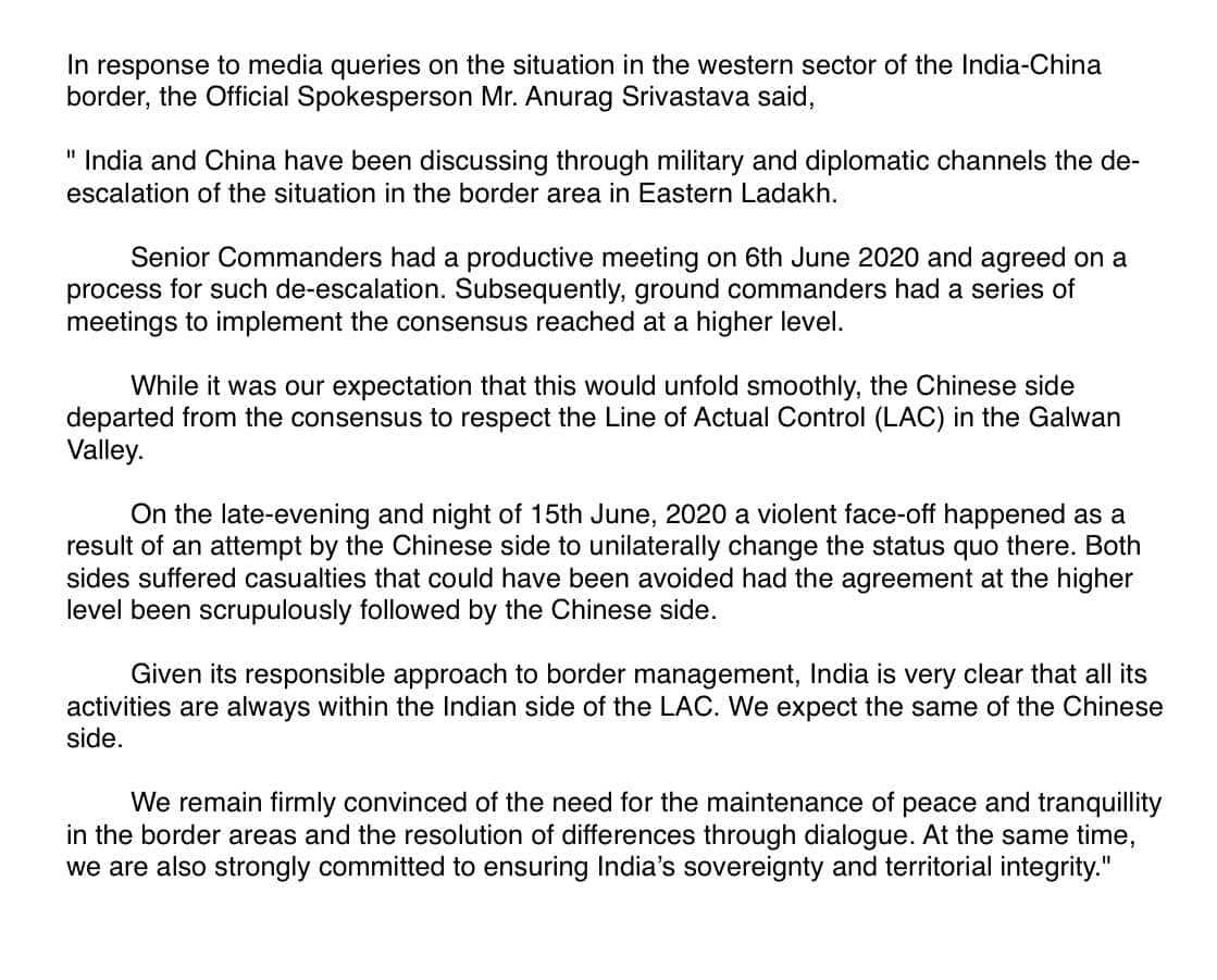 গালওয়ান উপত্যকায় যে রক্তক্ষয়ী সংঘর্ষ হয়েছে তা নিয়ে স্বরাষ্ট্রমন্ত্রকের তরফে যে বিবৃতি দেওয়া হয়েছে, তাতে বলা হয়েছে ৷ দু’দেশের মধ্যে উচ্চ-পর্যায়ের বৈঠকে যে সমঝোতা হয়েছিল তা মেনে চলা হলে এই রক্তক্ষয়ী সংঘর্ষ এড়ানো যেত ৷এখনও পর্যন্ত ভারতের যাবতীয় কার্কলাপ প্রকৃত নিয়ন্ত্রণরেখার মধ্যে সীমাবদ্ধ থাকলেও প্ররোচনা ছাড়াই শান্তিব্যবস্থা ভেঙে হামলা হয়েছে বেজিংয়ের তরফে ৷