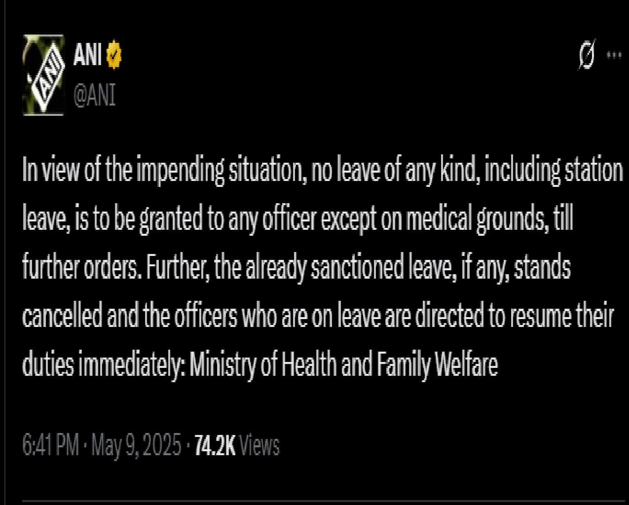 NO Leave To Any Medical Officer: ভারত-পাকিস্তান উত্তেজনার কারণে কেন্দ্রীয় স্বাস্থ্য মন্ত্রক সব ছুটি নিষিদ্ধ করেছে। চিকিৎসাগত জরুরি ছাড়া কোনও ছুটি মঞ্জুর হবে না। ইতিমধ্যে মঞ্জুর ছুটিও বাতিল। লাইভ কভারেজও নিষিদ্ধ।