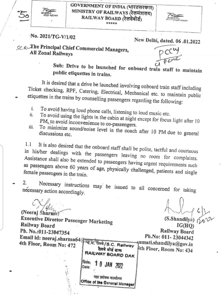 কলকাতা: রাতের ট্রেন সফরে নিশ্চিন্তে ঘুমোন। ঘুমের ব্যাঘাত যাতে সহযাত্রীদের আচরণে না ঘটে তা এবার নিশ্চিত করছে ভারতীয় রেল। ভারতীয় রেলওয়ে বোর্ডের তরফ থেকে দেশের প্রতিটি জোনের প্রিন্সিপাল চিফ কমার্শিয়াল ম্যানেজারদের কাছে একটি নির্দেশিকা পাঠানো হয়েছে। সেই শিষ্টাচার নির্দেশিকা অনুযায়ী বেশ কিছু নিয়ম পালন করতে হবে রেল যাত্রীদের। আর তাদের ওপরে নজর রাখবেন ও সাহায্য করবেন অন বোর্ড রেল কর্মীরা (Indian Railways news Rules in Trains during journey)।