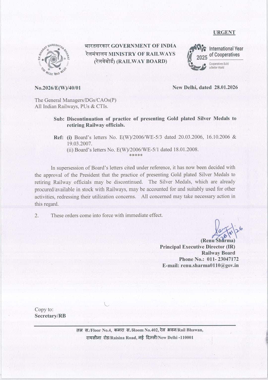 রেলওয়ে বোর্ডের প্রধান নির্বাহী পরিচালক রেণু শর্মা বুধবার, ২৮ জানুয়ারি ২০২৬ তারিখে এ বিষয়ে একটি সরকারি নোটিফিকেশন জারি করেন। নোটিফিকেশনে স্পষ্টভাবে বলা হয়েছে, “অবসরপ্রাপ্ত রেল কর্মকর্তাদের সোনার প্রলেপ দেওয়া রৌপ্য পদক প্রদানের প্রথা বন্ধ করা হলো।” এই নির্দেশ অবিলম্বে কার্যকর হবে এবং ভবিষ্যতে আর কোনও অবসরপ্রাপ্ত কর্মচারী এই পদক পাবেন না।