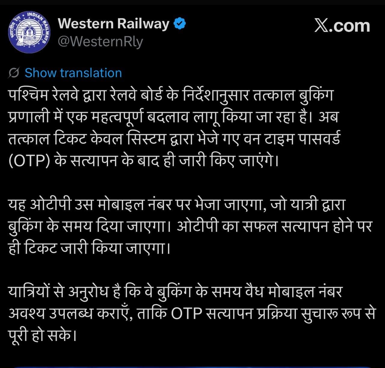 এখন থেকে সিস্টেম-জেনারেটেড ওয়ান-টাইম পাসওয়ার্ড (OTP) প্রমাণীকরণের পরেই তৎকাল টিকিট জারি করা হবে। বুকিংয়ের সময় যাত্রীর দেওয়া মোবাইল নম্বরে এই OTP পাঠানো হবে এবং OTP সফলভাবে যাচাই করার পরেই টিকিট জেনারেট করা হবে ৷