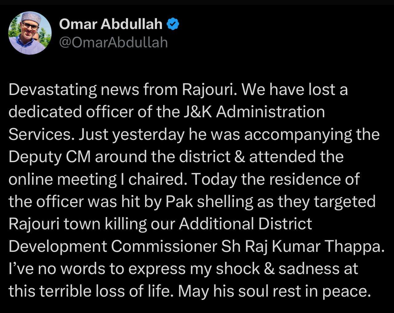 শনিবার ভোর ৫টা থেকেই রাজৌরিতে ভারী গোলাবর্ষণ শুরু হয় ৷ তার কিছুক্ষণের মধ্যেই রাজকুমার থাপার মৃত্যুর খবর পাওয়া যায় ৷ জম্মু-কাশ্মীরের মুখ্যমন্ত্রী ওমর আবদুল্লা এক্স হ্যান্ডলে লিখেছেন, ‘‘রাজৌরি থেকে মর্মান্তিক খবর পেলাম। জম্মু-কাশ্মীরের প্রশাসনিক বিভাগের এক ভাল অফিসারকে আমরা হারিয়েছি। গতকালই তিনি উপমুখ্যমন্ত্রীর সঙ্গে ছিলেন, আমার সঙ্গে অনলাইন বৈঠকেও ছিলেন। আজ ওই অফিসারের বাড়িতে পাকিস্তানের বোমা গিয়ে পড়েছে। রাজকুমার থাপার মৃত্যু হয়েছে। আমি স্তম্ভিত, শোকপ্রকাশের ভাষা নেই। ওঁর আত্মার শান্তি কামনা করছি।’’