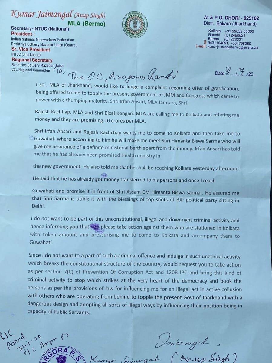 রবিবাসরীয় সন্ধ্যায় ঝাড়খন্ডের বিধায়ক কুমার জয়মঙ্গল একটি অভিযোগ দায়ের করেছেন থানায়৷ সেই অভিযোগে তিনি উল্লেখ করেছেন, তিন বিধায়ক ইরফান আনসারি, রাজেশ কাচ্চপ ও বিক্সাল কংগারি তাকেও চাপ দিয়েছিলেন কলকাতা যাওয়ার জন্যে ৷ বিধায়ক পিছু ১০ কোটি টাকা করে দেওয়া হবে এমন প্রতিশ্রুতিও দেওয়া হয়েছিল। তার অভিযোগ, ইরফান আনসারি তাকে জানিয়েছিলেন, রাজেশ কাচ্চপকে সঙ্গে নিয়ে তাকে গুয়াহাটি নিয়ে যাওয়া হবে। সেখানে সাক্ষাৎ করানো হবে হিমন্ত বিশ্বশর্মার সাথে। সেখানে অর্থের পাশাপাশি মন্ত্রীত্বও দেওয়া হবে বলে জানিয়েছিলেন।