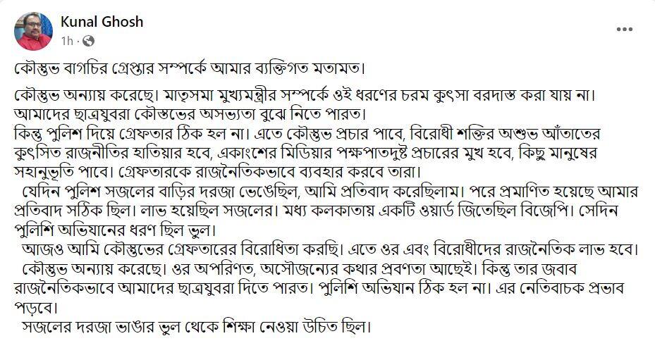 কুণাল ঘোষ আরও লেখেন, '' গ্রেফতারকে রাজনৈতিকভাবে ব্যবহার করবে তারা। যেদিন পুলিশ সজলের বাড়ির দরজা ভেঙেছিল, আমি প্রতিবাদ করেছিলাম। পরে প্রমাণিত হয়েছে আমার প্রতিবাদ সঠিক ছিল। লাভ হয়েছিল সজলের। মধ্য কলকাতায় একটি ওয়ার্ড জিতেছিল বিজেপি। সেদিন পুলিশি অভিযানের ধরণ ছিল ভুল। আজও আমি কৌস্তুভের গ্রেফতারের বিরোধিতা করছি। এতে ওর এবং বিরোধীদের রাজনৈতিক লাভ হবে। কৌস্তুভ অন্যায় করেছে। ওর অপরিণত, অসৌজন্যের কথার প্রবণতা আছেই। কিন্তু তার জবাব রাজনৈতিকভাবে আমাদের ছাত্রযুবরা দিতে পারত। পুলিশি অভিযান ঠিক হল না। এর নেতিবাচক প্রভাব পড়বে।