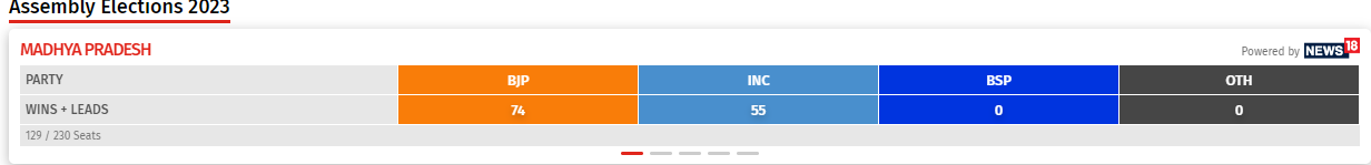 এদিন ট্রেন্ডে প্রাথমিক লক্ষণ দেখা গিয়েছে যে কংগ্রেসের থেকে কিছুটা এগিয়ে রয়েছে বিজেপি। তবে ভোটগণনার প্রথম দিকে পোস্টাল ব্যালট গণনা হয়ে থাকে। ফলে পরবর্তী সময়ে ট্রেন্ডেও হিসাবেও বদল আসবে পারে। যদিও মধ্যপ্রদেশের প্রাক্তন মুখ্যমন্ত্রী এবং কংগ্রেস নেতা কমন নাথ বলেছেন, ‘মধ্যপ্রদেশের ভোটদাতাদের উপর আমার আস্থা রয়েছে।’