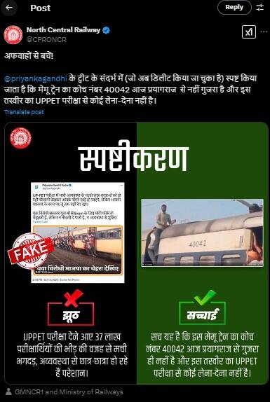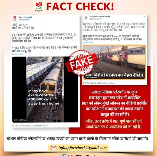 আরও তদন্তে দেখা গেছে যে এই ভিডিওটি পূর্বে ভুল তথ্য দিয়ে ভাইরাল হয়েছিল, এটিকে ইউপি পিইটি পরীক্ষার প্রার্থীদের মধ্যে পদদলিত হওয়ার সঙ্গে যুক্ত করে মিথ্যাভাবে দেখানো হয়েছিল। সেই সময়, উত্তর মধ্য রেলওয়ে দাবিটি মিথ্যা বলেছিল , স্পষ্ট করে বলেছিল যে এই ট্রেনটি ইউপির প্রয়াগরাজের মধ্য দিয়ে যায় না।