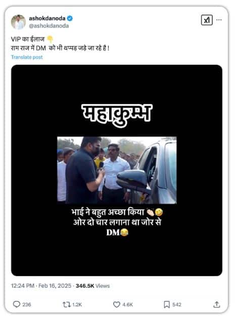 যে ব্যক্তি ডিএমকে চড় মেরেছে, লোকেরা তার প্রশংসা করে বলছে যে এই ভিডিওটি মহাকুম্ভের। ভিডিওটির লেখায় লেখা আছে, “মহাকুম্ভ ভাই দারুণ কাজ করেছেন এবং আপনার আরও কয়েকবার ডিএমডি করা উচিত ছিল”। ইনস্টাগ্রামে এই ভিডিওটি শেয়ার করে একজন ইউজার লিখেছেন, “ভিআইপি ট্রিটমেন্ট, রামরাজ্যে এমনকি ডিএমদেরও চড় মারা হচ্ছে!” ভাইরাল পোস্টটির আর্কাইভ সংস্করণ এখানে দেখা যাবে।