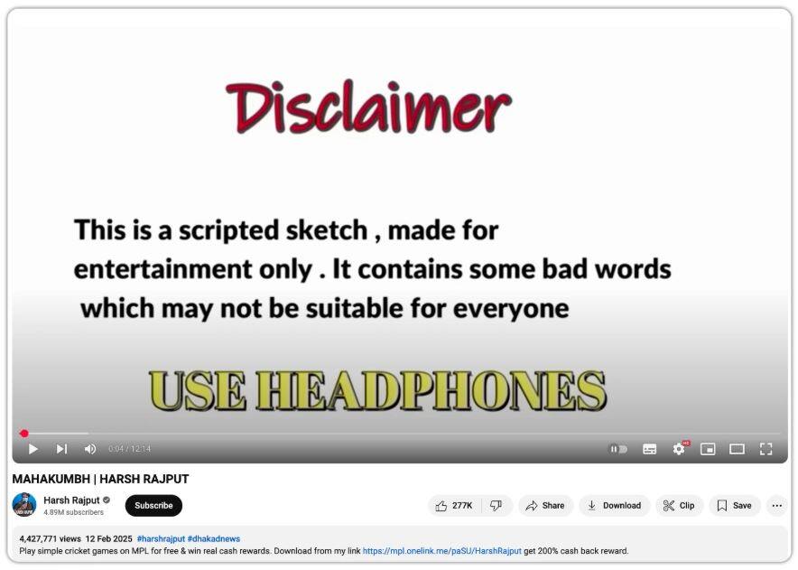 কিন্তু আমরা ভিডিওটির শুরুতে একটি ডিসক্লেমার লেখা দেখেছি। ইংরেজিতে লেখা ডিসক্লেমার, এই ভিডিওটি স্ক্রিপ্টেড এবং শুধুমাত্র বিনোদনের জন্য তৈরি করা হয়েছে। পুরো ভিডিওটি দেখার পর, আমরা অনেক সূত্র পেয়েছি যা প্রমাণ করে যে ভিডিওটি স্ক্রিপ্টেড। উদাহরণস্বরূপ, এই ভিডিওতে, প্রয়াগরাজ মহাকুম্ভে ভাইরাল হওয়া অনেক লোককে অনুকরণ করা হয়েছে। যেমন “আইআইটি বাবা”, “এক হাত উঁচু বাবা” ইত্যাদি।