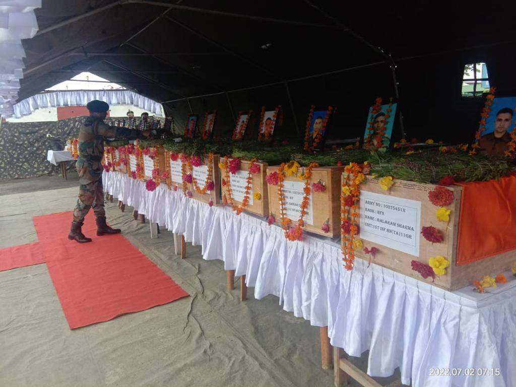 দুটি IAF বিমান ও একটি ভারতীয় সেনার হেলিকপ্টারে টেরিটোরিয়াল আর্মির ১৪জন শহিদ জওয়ানের মৃতদেহ ইতিমধ্যেই বাড়ি পাঠানো হয়েছে, সেখানে সামরিক ঐতিহ্য মেনে তাঁদের শেষ শ্রদ্ধা জানানো হবে।
