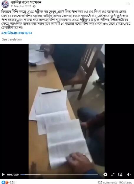 এক ফেসবুক ব্যবহারকারী একই দাবি করে ক্যাপশনে লেখেন, "কিভাবে হিন্দি বলয়ে UPSC পরীক্ষা হয় দেখুন, এরাই কিন্তু পাশ করে IAS IPS কিংবা IFS হয় অথচ এদের মেধা যে কোনও বাঙালি-তালিম-তেলেগু ব্যক্তির থেকে বহুগুণে কম। এই ভাবে যুগে যুগে তারা পাশ করেছে এবং সাহায্য করে চলেছে হিন্দি সাম্রাজ্যবাদ।