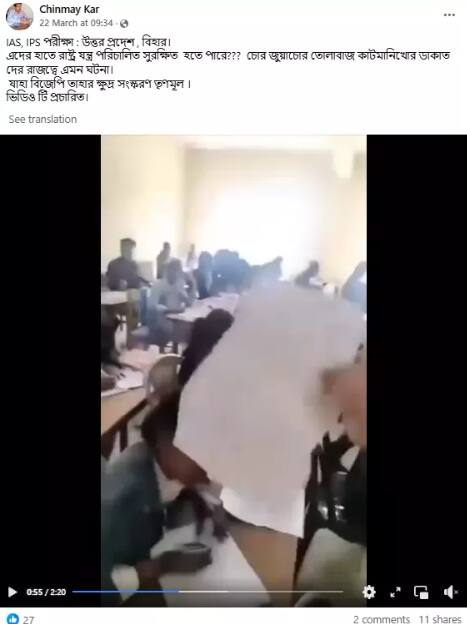 এক ফেসবুক ব্যবহারকারী ভিডিওটি শেয়ার করে ক্যাপশনে দাবি করেন, “IAS, IPS পরীক্ষা : উত্তর প্রদেশ , বিহার। এদের হাতে রাষ্ট্র যন্ত্র পরিচালিত সুরক্ষিত হতে পারে??? চোর জুয়াচোর তোলাবাজ কাটমানিখোর ডাকাত দের রাজত্বে এমন ঘটনা। যাহা বিজেপি তাহার ক্ষুদ্র সংস্করণ তৃণমূল । ভিডিও টি প্রচারিত।”