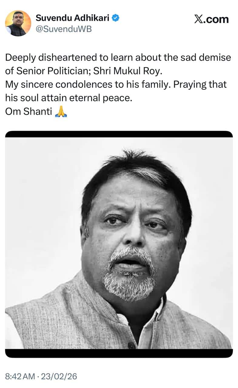 মুকুল রায়ের প্রয়াণে এক্স হ্যান্ডেলে গভীর শোক প্রকাশ করেছেন রাজ্যের বিরোধী দলনেতা তথা শুভেন্দু অধিকারী থেকে অভিষেক বন্দ্যোপাধ্যায়। তাঁর পোস্টে শুভেন্দু লিখেছেন, “প্রবীণ রাজনীতিবিদ মুকুল রায়ের প্রয়াণে গভীর ভাবে শোকাহত। তাঁর আত্মার শান্তি কামনা করি। স্বর্গীয় মুকুল রায়ের পরিবারের প্রতি আমার আন্তরিক সমবেদনা জানাই।”